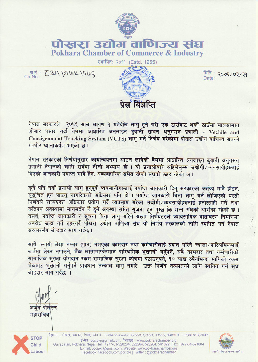 पोखरा, १ साउन । साउन १ गतेबाट लागु भएको वेबमा आधारित अनलाइन ढुवानीमा साधन अनुगमन प्रणाली (भिसिटिएस) प्रति पोखरा उद्योग वाणिज्य संघले ध्यानाकर्षण भएको जनाएको छ । महासचिव अर्जुन पोखरेलद्वारा जारी विज्ञप्तिमा उक्त प्रणाली तत्कालको लागि स्थगित गर्न आग्रह गरिएको छ ।