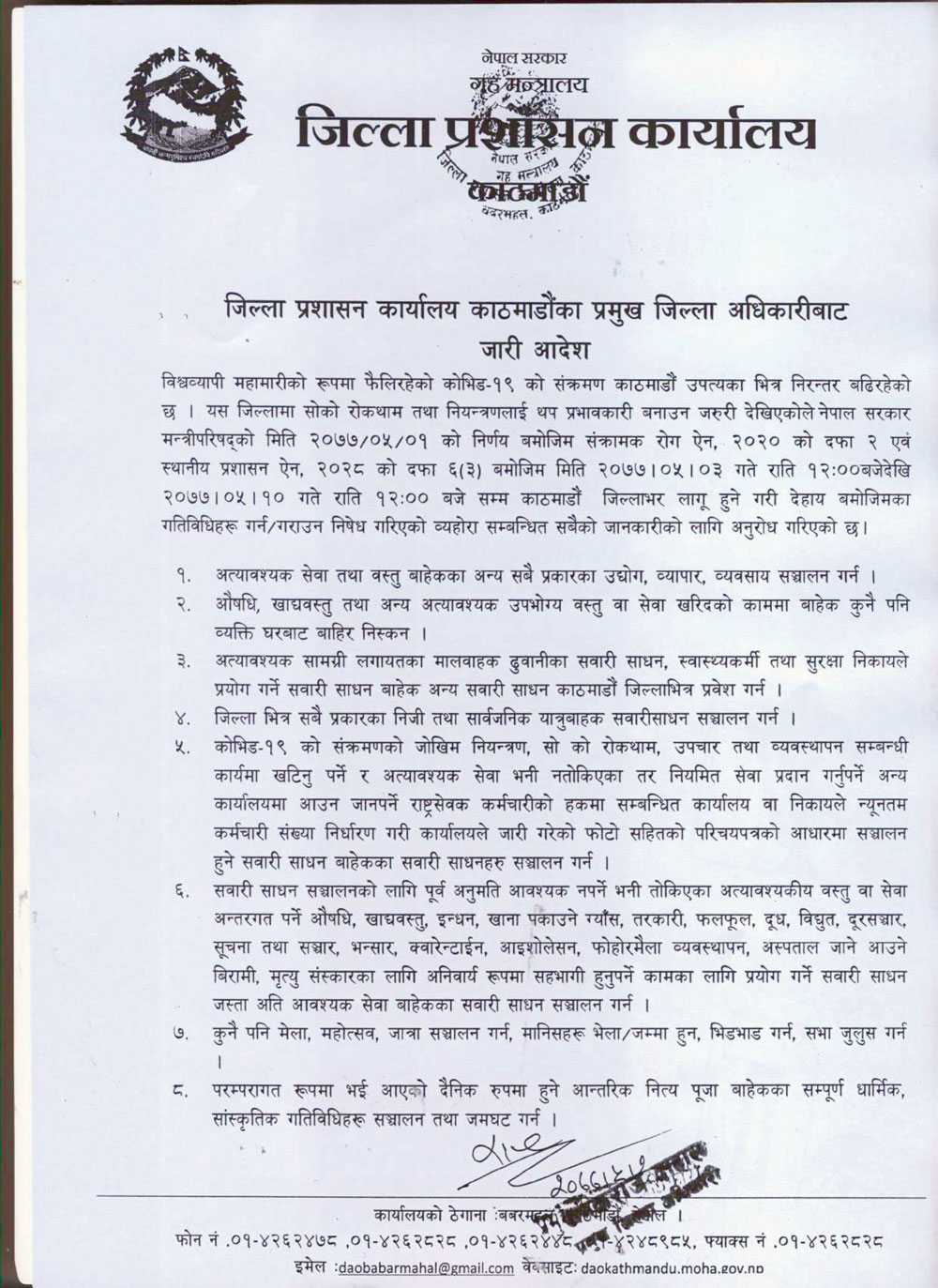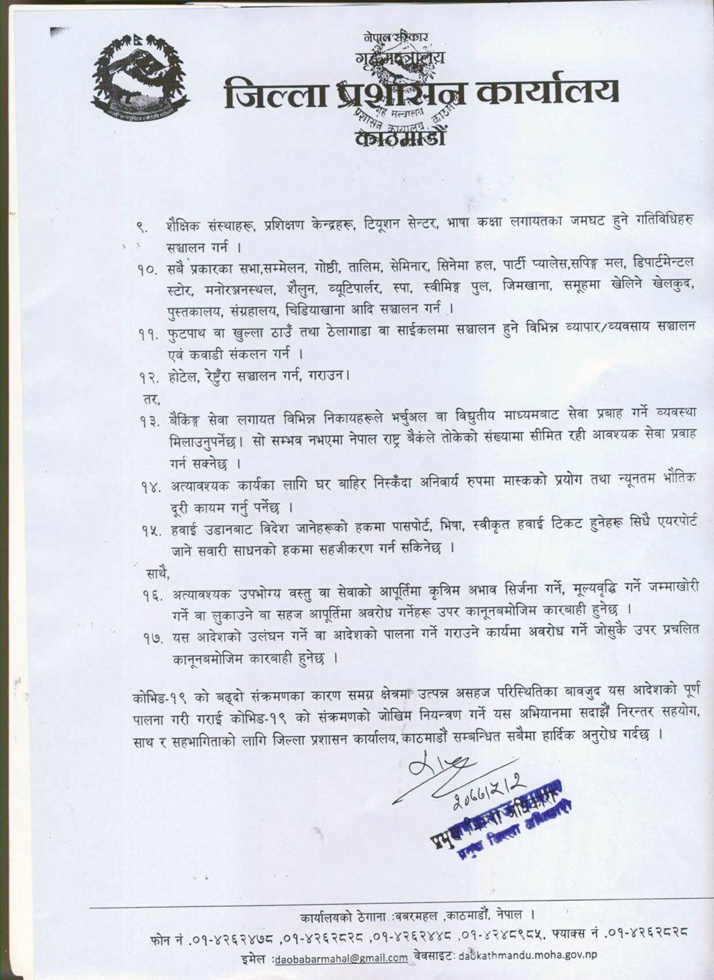 काठमाडौं । आज राति १२ बजेदेखि राजधानी काठमाडौंमा निशेधाज्ञा लागु हुँदैछ । निशेधाज्ञामा केके गर्न पाइन्छ, केके गर्न पाइदैन भनेर जिल्ला प्रशासन कार्यालय काठमाडौंले जारी गरेको सूचना यस्तो छ ।