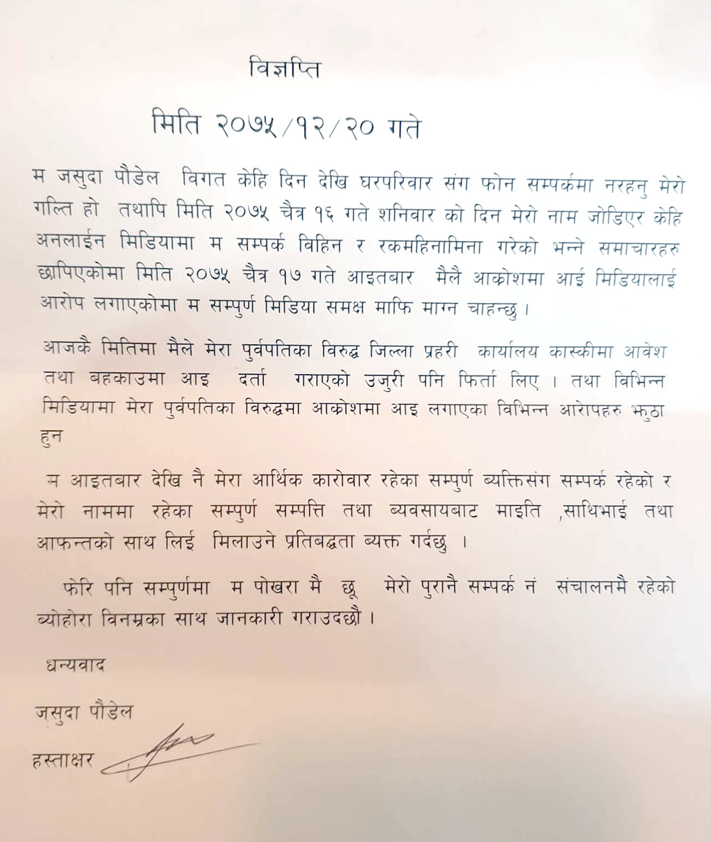 पोखरा, २० चैत । विभिन्न व्यक्तिहरुको तिर्नुपर्ने रकम नतिरी सम्पर्क बिहीन भएको आरोप लागेकी पोखराकी जसुदा पौडेलले आफू सम्पूर्णसँग सम्पर्कमा रहेको बताएकी छन् । सम्पर्क बिहीन भएको भनेर समाचार आएपछि आक्रोशमा सञ्चारमाध्यम विरुद्ध बोलेको भन्दै उनले क्षमासमेत मागेकी छन् । ‘बिगत केही दिनदेखि घरपरिवारसँग सम्पर्कमा नरहनु गल्ती थियो,’ उनले भनेकी छन् ।