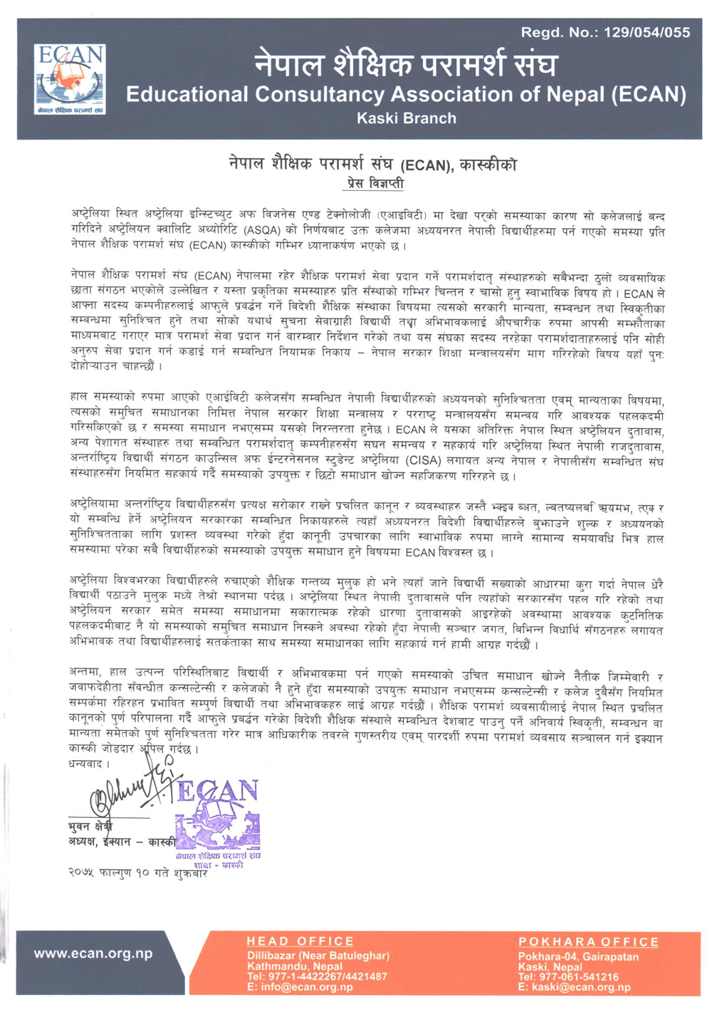 अष्ट्रेलियामा अन्तर्राष्ट्रिय विद्यार्थीहरुसँग प्रत्यक्ष सरोकार राख्ने प्रचलित कानून र ब्यवस्थाहरु र यो सम्बन्धि हेर्ने अष्ट्रेलियन सरकारका सम्बन्धित निकायहरुले त्यहाँ अध्ययनरत विदेशी विद्यार्थीहरुले बुझाउने शुल्क र अध्ययनको सुनिश्चितताका लागि प्रशस्त व्यवस्था गरेको हुँदा कानूनी उपचारका लागि स्वाभाविक रुपमा लाग्ने सामान्य समयावधि भित्र हाल समस्यामा परेका सबै विद्यार्थीहरुको समस्याको उपयुक्त समाधान हुने विषयमा इक्यान विश्वस्त रहेको विज्ञप्तिमा उल्लेख छ ।