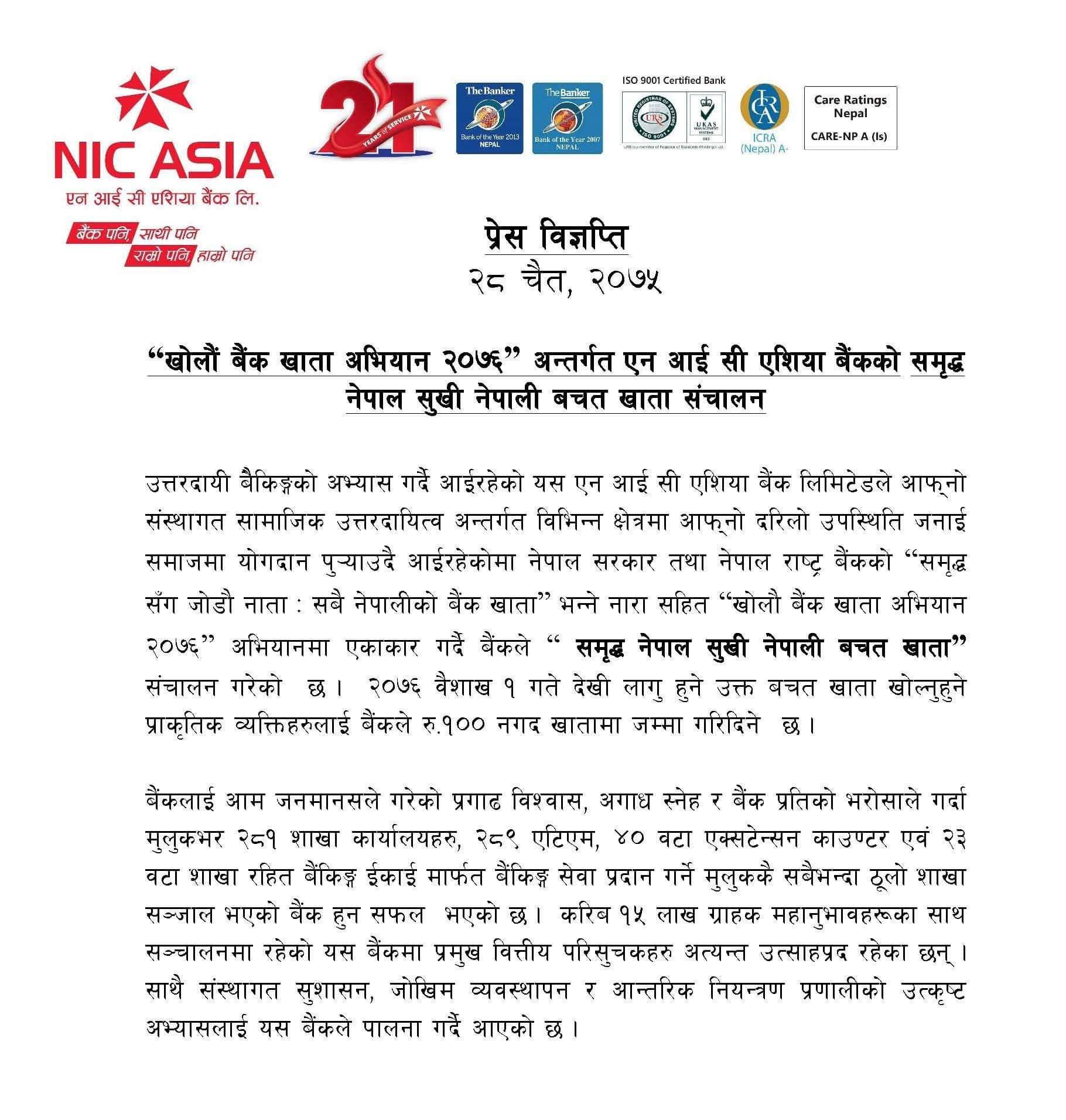 खोलौं बैंक खाता अभियान २०७६ अन्तर्गत एनआइसी एसियाले बैंकले समृद्ध नेपाल सुखी नेपाली बचत खाता संचालन अभियान शुरु गर्ने भएको छ ।