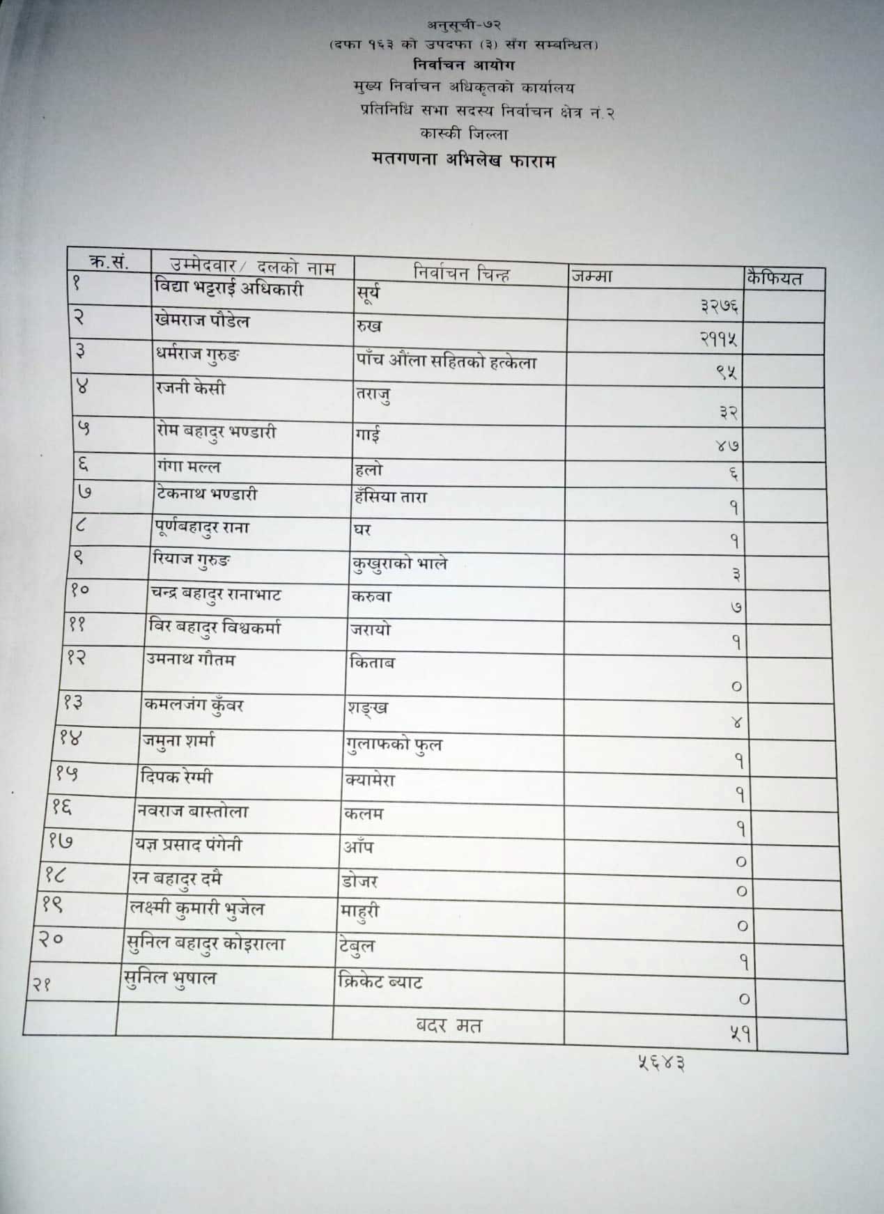 नेकपा उम्मेदवार विद्या भट्टराई अधिकारीले हालसम्म ३२७६ मत प्राप्त भरेकी छन् भने काँग्रेसका खेमराज पौडेलले २११५ मत प्राप्त गरेका छन् । गणना सम्पन्न भएको वडा ३३ हो । अहिले २१ नम्बर वडा गणना भइरहेको छ ।