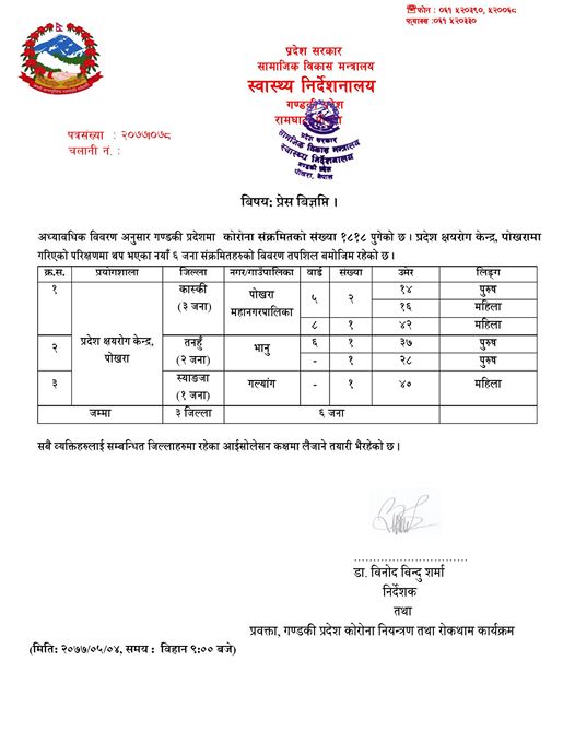 गण्डकी प्रदेशमा ६ कोरोना संक्रमित थपिएका छन् । कास्की, तनहुँ र स्याङ्जा गरी ३ जिल्लामा ६ संक्रमित थपिएको स्वास्थ्य निर्देशनालय गण्डकी प्रदेशले जनाएको छ ।