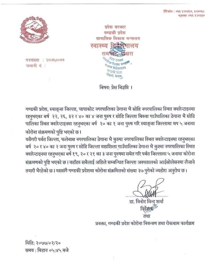 पोखरा । गण्डकी प्रदेशमा कोरोना संक्रमित १० जना थपिएका छन् । मंगलबार बिहानसम्म कुल संक्रमित ३७ जना पुगेका छन् ।