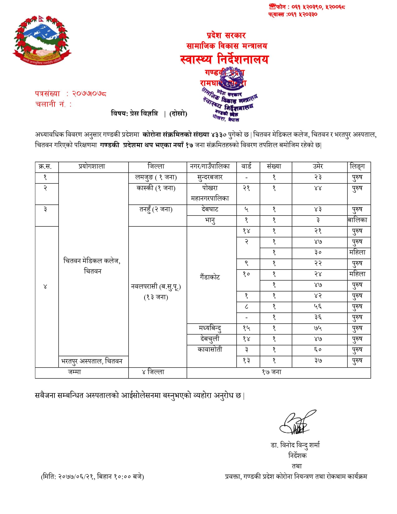 चितवन मेडिकल कलेज, चितवन र भरतपुर अस्पताल, चितवन गरिएको परिक्षणमा गण्डकी प्रदेशमा १७ जनामा संक्रमण पुष्टी भएको हो ।