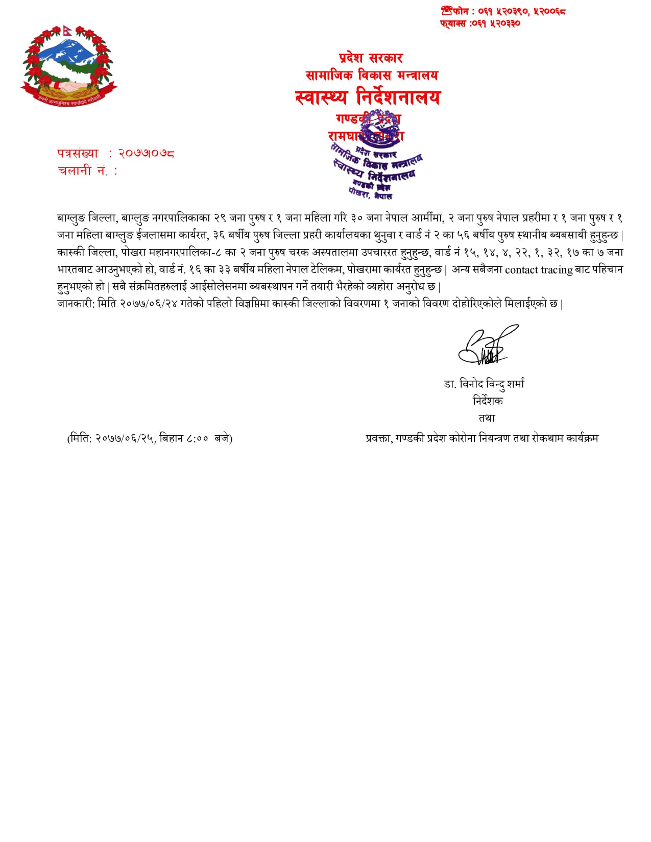संक्रमित हुनेमा कास्कीका २१ जना, बागलुङका ३६ जना र लमजुङका ५ जना रहेको स्वास्थ्य निर्देशनालय गण्डकी प्रदेशले जनाएको छ । संक्रमित हुनेमा सुरक्षाकर्मी, थुनुवा लगायत पनि छन् ।
