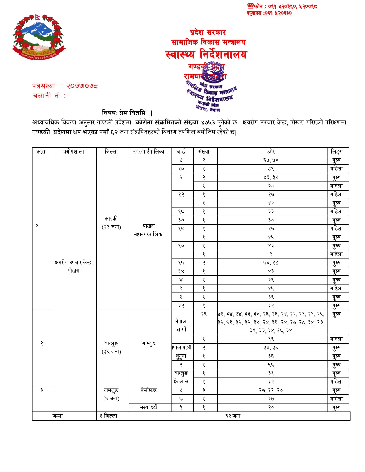 पोखरा । गण्डकी प्रदेशमा थप ६२ जनामा कोरोना संक्रमण पुष्टी भएको छ । यससँगै संक्रमितको संख्या ४ हजार ७ सय ५३ पुगेको छ ।