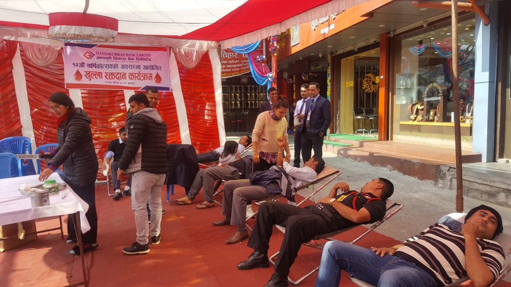 पहिलो कार्यक्रम अन्तरगत बैंकले वर्तमान समयमा रहेको मानव जीवनसँग प्रत्यक्ष सरोकार राखेको रक्त अभावलाई मध्यनजर गरी खुल्ला रक्तदान कार्यक्रम आयोजना गर्यो । बैंकको प्रधान कार्यालय प्राङ्गण वि. पी. चोक, चिप्लेढुङ्गा पोखरामा क्षेत्रीय रक्त सञ्चार सेवा, रामघाट पोखराको सहयोगमा सञ्चालित उक्त रक्तदान कार्यक्रमवाट ८१ यूनिट रगत संकलन गरियो । बैंकका सञ्चालक पद्य प्रसाद पौडेलबाट पहिलो रक्तदाता कृष्ण पौडेललाई ब्लड व्यवग हस्तान्तरण गरी शुभारम्भ थियो । कार्यक्रममा बैंकका कर्मचारी एंवम् सर्वसाधारणले सहभागिता थियो । कार्यक्रमलाई सम्बोधन गर्दै बैंकका प्रमुख कार्यकारी अधिकृत श्री रेशम बहादुर थापाले बैंकले सामाजिक उत्तरदायित्वलाई उच्च प्राथमिकता दिदै आगामी दिनमा पनि यस्ता कार्यक्रमहरुलाई निरन्तरता दिदै जाने प्रतिवद्धता व्यक्त गरे ।