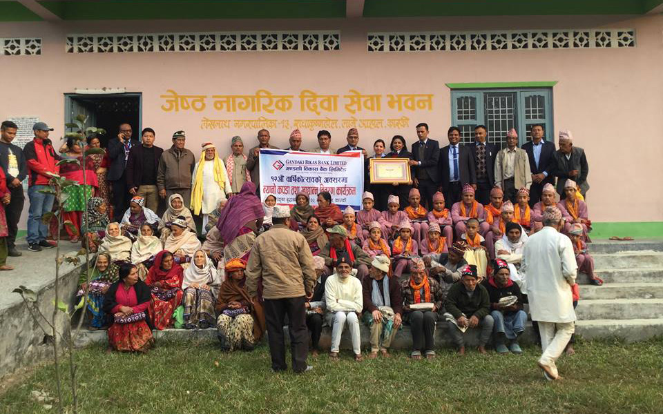वार्षिकोत्सवकै अवसर पारेर बैंकले पोखरा ३२, लामेआहाल स्थित राधाकृष्ण बृद्धाश्रममा एक कार्यक्रमका विच खाद्यान्न तथा न्यानो कपडा वितरण गरेको छ । कार्यक्रममा आश्राम रहेका ४६ जना बृद्धबृद्धा तथा १८ जना बटुकलाई बैंकका सञ्चालकद्धय पद्य प्रसाद पौडेल र नारायण बहादुर बाँनियाद्धारा उक्त सामाग्रीहरु हस्तान्तरण गरिएको हो । वितरण कार्यक्रममा बैंकका सञ्चालक पद्यप्रसाद पौडेल तथा नायव प्रमुख कार्यकारी अधिकृत छविन्द्रनाथ शर्माले सामाजिक उत्तरदायित्वमा बैंक निकै सचेत रहेको र यस प्रकारका कार्यक्रमहरुलाई आगामी दिनमा पनि प्राथमिकताका साथ अगाडि बढाउने नीति बैंकसँग रहेको बताए । बृद्धाश्रमका अध्यक्ष प्रेम लिगलले आफ्नो अपेक्षा गरे भन्दा पनि बढि सहयोग प्रदान गरेकोमा बैंक परिवारलाई धन्यवाद सहित बैंकको उत्तरोत्तर प्रगतिको शुभकामना व्यक्त गरे ।