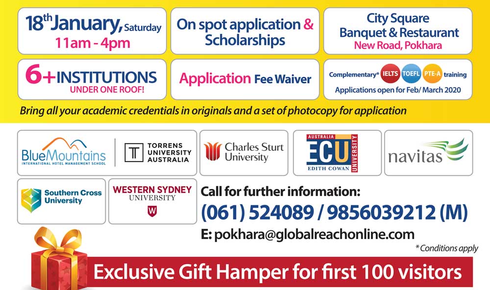 पोखरा । उच्च शिक्षा अध्ययनका लागि अष्ट्रेलिया जान चाहने विद्यार्थीलाई परामर्श सेवा प्रदान गर्दै आइरहेको ग्लोबल रिच पोखराको आयोजनामा ‘द विगेष्ट अष्ट्रेलियन एजुकेसन फेयर’ हुने भएको छ । आगामी माघ ४ गते शनिबार अर्थात जनवरी १८ मा फेयर हुनेछ । पोखराको न्युरोडस्थित सिटी स्वायरमा फेयर हुने शाखा कोअर्डिनेटर सरिता गुरुङले जानकारी दिइन् ।