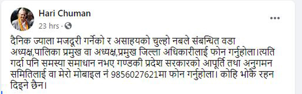 पोखरा । गण्डकी प्रदेशका आन्तरिक मामिला तथा कानुनमन्त्री हरिबहादुर चुमानले घरमा चुलो नबले सिधै आफूलाई फोन गर्न दैनिक ज्याला मजदूरी गर्ने र असहाय व्यक्तिहरुलाई आग्रह गरेका छन् ।