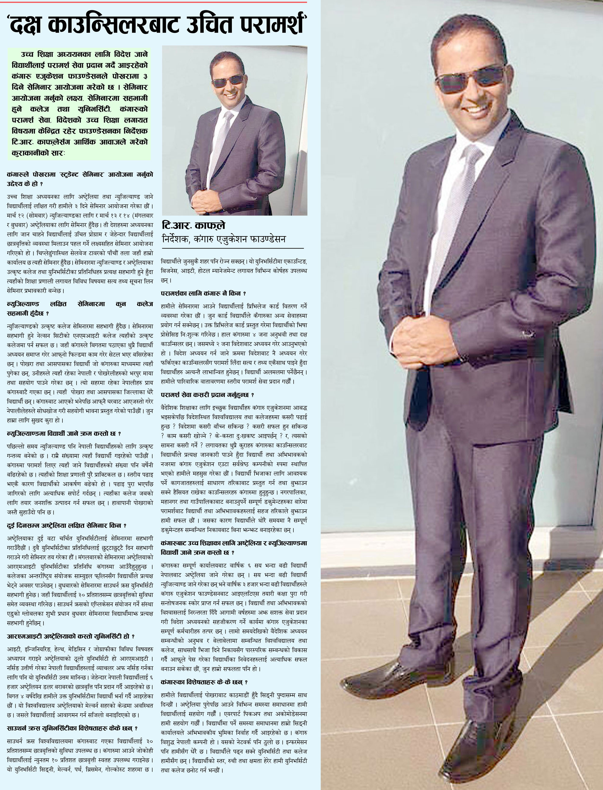 उच्च शिक्षा अध्ययनका लागि विदेश जाने विद्यार्थीलाई परामर्श सेवा प्रदान गर्दै आइरहेको कंगारु एजुकेशन फाउण्डेसनले पोखरामा ३ दिने सेमिनार आयोजना गरेको छ । सेमिनार आयोजना गर्नुको लक्ष्य, सेमिनारमा सहभागी हुने कलेज तथा युनिभर्सिटी, कंगारुको परामर्श सेवा, विदेशको उच्च शिक्षा लगायत विषयमा केन्द्रित रहेर फाउण्डेसनका निर्देशक टि.आर. काफ्लेसँग आर्थिक आवाजले गरेको कुराकानीको सारः