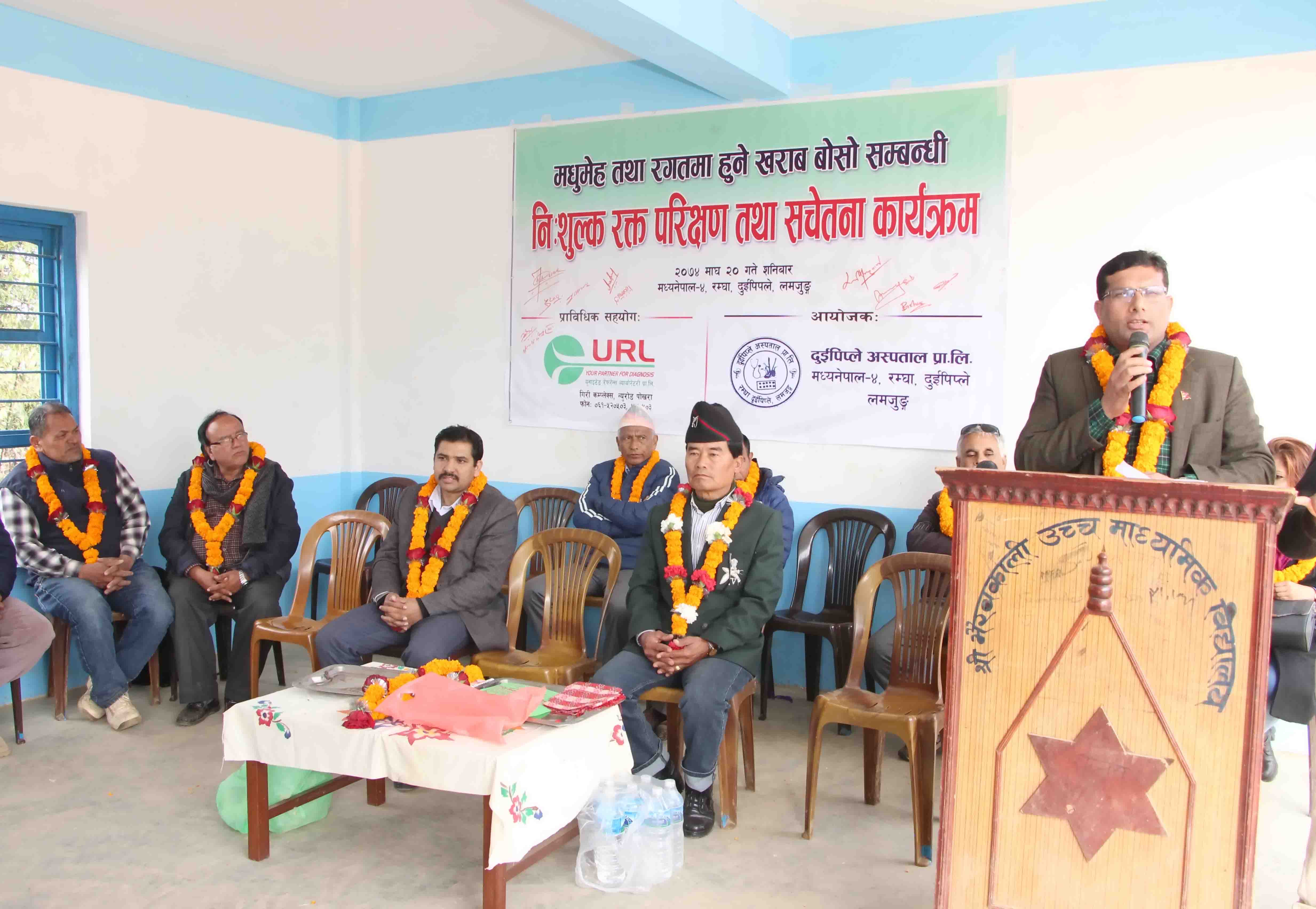 दुईपिप्ले अस्पताल प्रालि, मध्यनेपाल–४, दुइपिप्ले, लमजुङको आयोजना र पोखरा लेखनाथको युनाइटेड रेफरेन्स ल्याबोरेटरी प्रालि (युआरएल)को प्राविधिक सहयोगमा शनिबार निःशुल्क शिविर भएको छ । शिविरमा ४ सय ७ जनाको मधुमेह तथा रगतमा हुने खराब बोसो सम्बन्धी रक्त परीक्षण गरिएको छ ।
