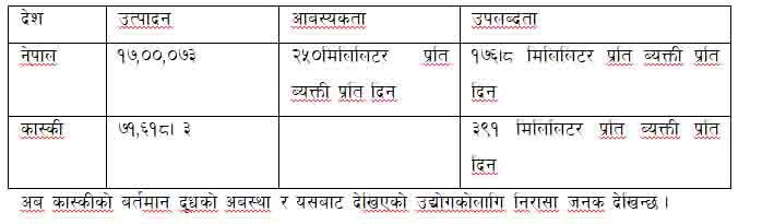 ४ . जिल्लाका सबै उद्योगहरु पुर्णरुपमा चल्ने हो आफ्नो उत्पादन ,हाल बहिरबाट आएको ४०००० लि . बाहेक दैनिक ६०००० लि. आबश्यक पर्छ । कास्कीको दूधको अबस्था माथीको तालिकाबाट पनि देखाउन सकिन्छ । पोखरामा खुला दुूध बिक्रीको अबस्था भयबह रहेको छ । अब दुई वा तिन बर्षमा यस्तै अबस्था रहेमा प्रशोधन उद्योग धरासायी हुनसक्ने माथीको तालिकाले देखाउछ । साच्चैे जनतालाई प्रशोधित दूध हैन अप्रशोधित दुध खान प्रोत्साहित उपभोक्तामा गरिएको भान हुुन लागेको छ । यस्तो अबस्था निम्त्याउने हाम्रा नीति निर्माता हुन् भन्ने बिषय दुई मत नहोला । गुणस्तरका बारेमा सरकार सचेत त हुन प¥यो तर खुला दूधमा पनि मापदण्ड छ छैन हेनु पर्छ । यो देशमा यदि नयाँ रोजगारी र आत्मनिर्भर दूध उत्पादन हुने हो भने नेपाल अरु क्षेत्रमा भन्दा दूध क्षेत्रमा बढी संम्भाबना अहिले संम्मको उत्पादिय तथ्याङ्कीय स्थितीले देखाउछ । दूधमा आत्म निर्भर ३ बर्ष भित्र भनिएको थियो त्यो त हुन सकेन अव पनि उचित नीति निर्माण गरेर मानिसमा आकर्षण गर्न सकेमा आत्मनिर्भर बनाउन सके अरु क्षेत्रमा भन्दा यो क्षेत्र बढी राम्रो देखिन्छ ।