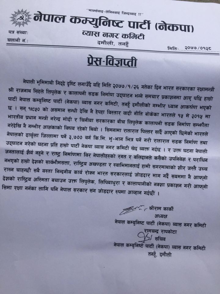 नेपाल कम्युनिष्ट पार्टी (नेकपा) व्यास नगर कमिटीले नेपालको सीमा रक्षा गर्नको लागि सरकारसँग आह्वान गरेको छ । देशको राष्ट्रिय अस्मिता बचाउन लिपुलेक, लिपियाधुरा र कालापानीको नक्सा प्रकाशन गर्न पनि सरकार सगँ माग गरेको छ ।