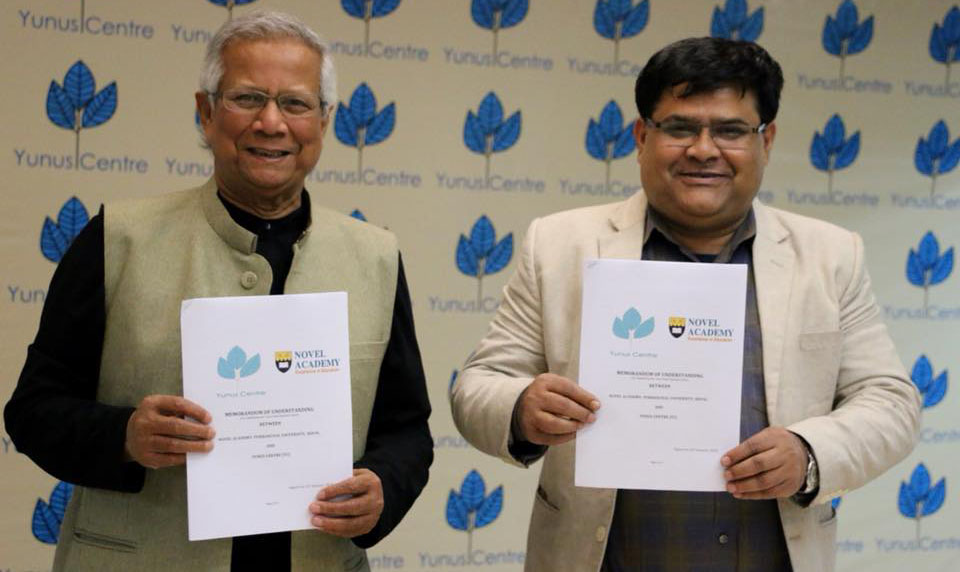 पोखराको नोभेल एकेडेमीले नेपालमा उद्यमशिलताको विकाश गर्नका लागि युनुस सोसियल बिजनेस सेन्टर बंगलादेश संग सहकार्य गर्न संझौता गरेको छ । उद्यमशिलताको विकाशमा उल्लेखनिय योगदान गरी समग्र बंगलादेश लाई नै आर्थिक क्रान्ति गराए बापत सन २००६ मा नोबेल पुरस्कार प्राप्त गर्न सफल माइक्रो फाइन्नासका जन्मदाता प्रो. मोहम्मद युनुसको संरक्षकत्वमा स्थापित युनुस सोसियल बिजनेस सेन्टर र नोभेल एकेडेमी पोखराका विच संझौता पत्रमा हस्ताक्षर भएको हो । युनुस सेन्टरका तर्फबाट अध्यक्ष प्रोफेसर मोहम्मद युनुस र नोभेल एकेडेमीका तर्फबाट प्रिन्सिपल डा. कृष्णराज भण्डारीले संयुक्त रुपमा हस्ताक्षर गरेका छन् ।