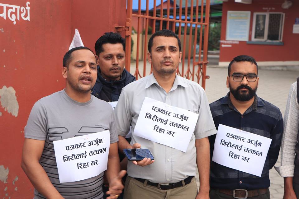 पोखराका पत्रकार अर्जुन गिरीको रिहाईको माग गर्दे नेपाल पत्रकार महासंघ तनहुँ शाखाले मंगलबार जिल्ला प्रशासन कार्यालयमा धर्ना दिएको छ । साइबर क्राइमको मुद्दामा नेपाल प्रहरीको केन्द्रीय अनुसन्धान ब्यूरो (सिआइबी)को हिरासतमा रहेका पत्रकार गिरीको रिहाईको माग गर्दै तनहुँका पत्रकारहरुले प्रशासनमा ४ बजे देखि ५ वजे सम्म धर्ना दिएका हुन् ।