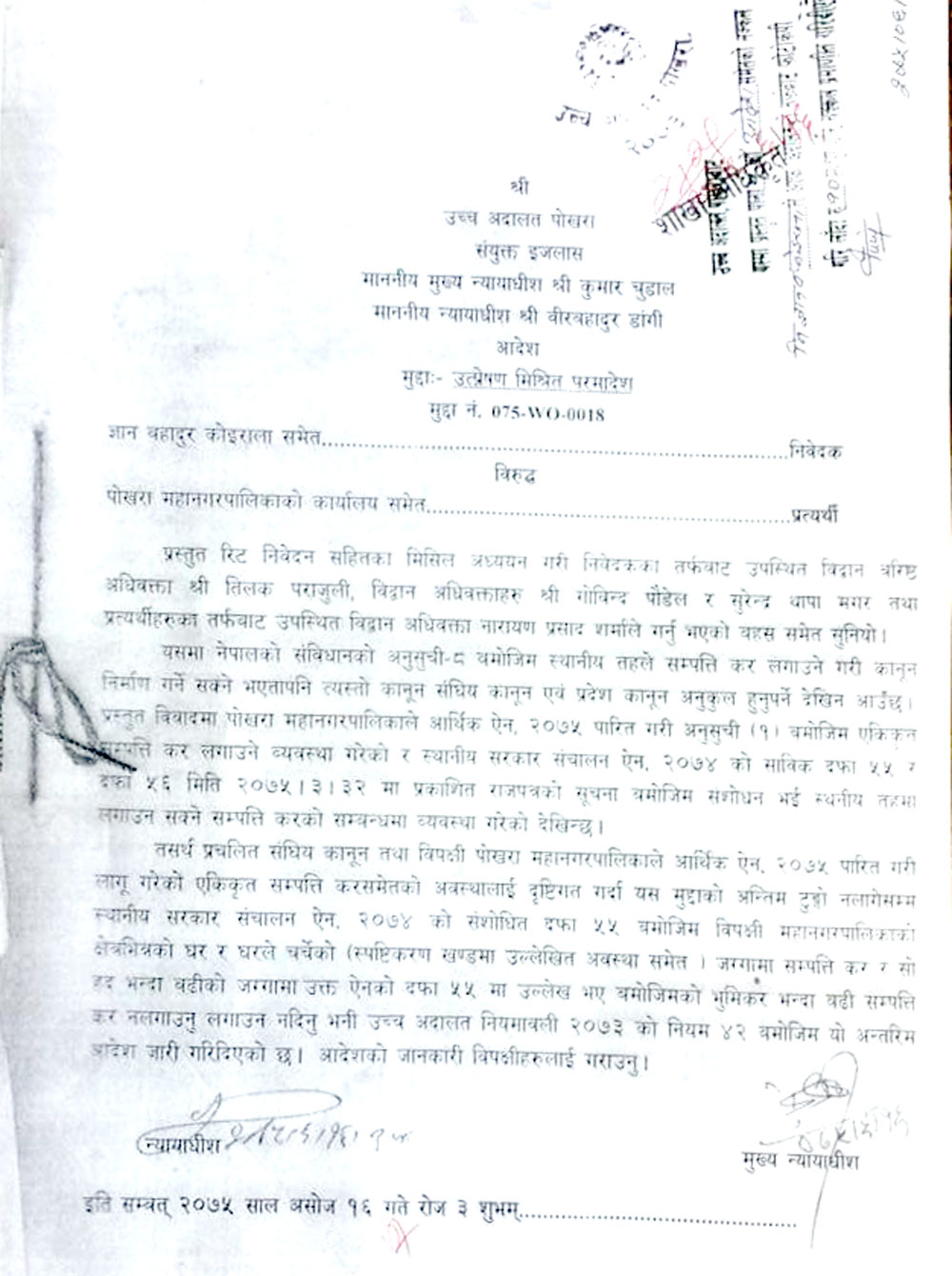 मुख्य न्यायाधीस कुमार चुडाँल र न्यायाधीस वीरबहादुर डाँगीको संयुक्त इजलासले यस्तो फैसला गरेको हो ।