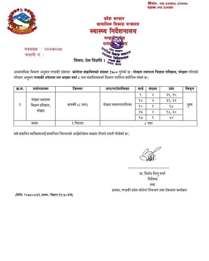 पोखरा स्वास्थ्य विज्ञान प्रतिष्ठानमा गरिएको परिक्षणमा ८ जनाको रिपोर्ट पोजेटिभ आएको स्वास्थ्य निर्देशनालयले जारी