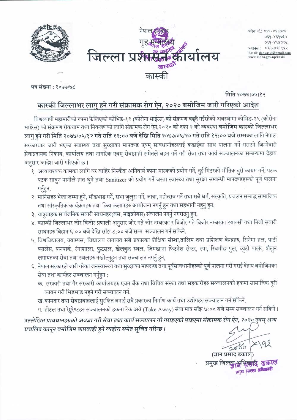 पोखरा । कास्कीमा जारी निशेधाज्ञा आज राति १२ बजेबाट लागु हुने गरी खुकुलो बनाइको छ । निशेधाज्ञा खुकुलो भएपनि सम्पूर्ण सेवा सुरु भने भएको छैन ।