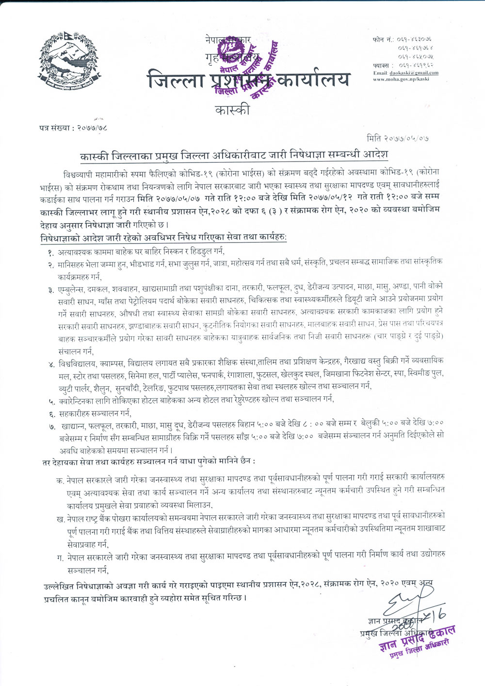 समुदायमा कोरोना संक्रमण बढेकाले निशेधाज्ञा थप गर्न महानगरले जिल्ला प्रशासनलाई सिफारिस गरेको थियो । जिल्ला प्रशासन कार्यालयले विज्ञप्ति जारी गरी थपिएको समयमा निशेधाज्ञाको पूर्ण पालना गर्न सर्वसाधरणलाई आह्वानसमेत गरेको छ ।