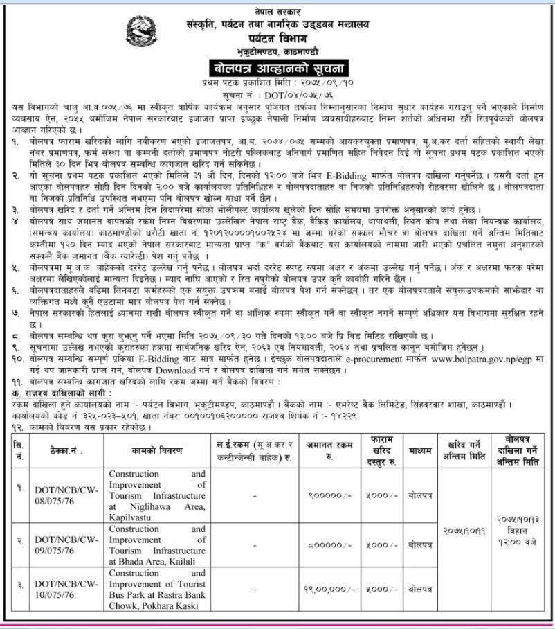 बोलपत्र खरिद गर्ने अन्तिम मिति माघ ११ गतेसम्म तोकिएको छ भने माघ १३ गते मध्याह्न १२ बजेसम्ममा बुझाई सक्नुपर्ने सूचनामा उल्लेख छ । टेण्डर ई बिडिङमार्फत दाखिला गर्नुपर्ने जनाइएको छ । टेण्डर भर्दा टेण्डर शुल्क ५ हजार र धरौटी १९ लाख राख्नुपर्ने सीमा तोकिएको छ । पोखराको पर्यटन बसपार्कसँगै पर्यटन विभागले कविलवस्तुको निग्लिहवा क्षेत्रको पर्यटन पूर्वाधार र कैलालीको भडा क्षेत्रको पर्यटन पूर्वाधारकोपनि टेण्डर आह्वान गरेको छ ।