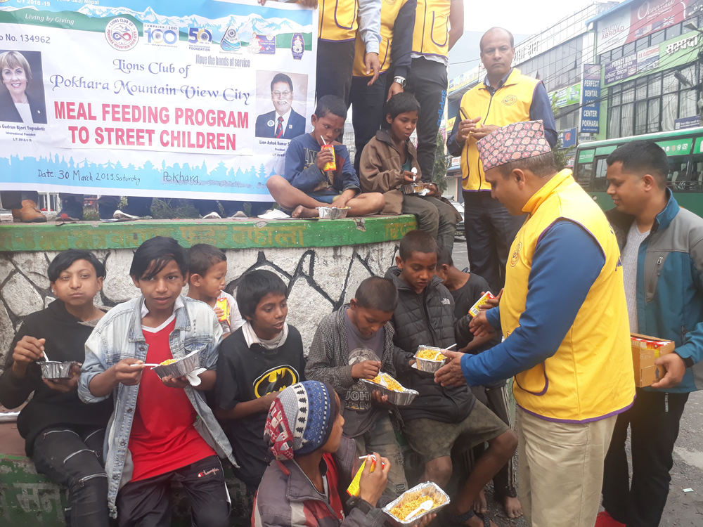 यसैबीच, क्लबले सडक बालबालिकाहरुलाई खाना खुवाउने कार्यक्रम शनिबार बिहान सम्पन्न गरेको छ । पोखराको चिप्लेढुंगामा १५ जना सडक बालकलाई खाना खुवाएर शुरूवात भएको कार्यक्रम तत पश्चात विन्दवासिनीको नजिक रहेका सडक बालक र केही असाहयलाई खाना खुवाइएको थियो । महेन्द्रपुल, पृथ्वीचोक लेकसाइड वरपर रहने सडक बालकलाई पनि खाना खुवाइएको क्लबले जनाएको छ । करिब एक सय जनालाई खाना खुवाइएको लायन वर्ष २०१८÷१९ का क्लब सचिव माधव तिमिल्सिनाले जानकारी दिए । सडक बालक रहेकै स्थानमा गएर खाना खुवाउँदा मानवीय सेवाको वास्तविक आनन्द मिलेको क्लबका अध्यक्ष टीकाराम सुबेदीले बताए ।