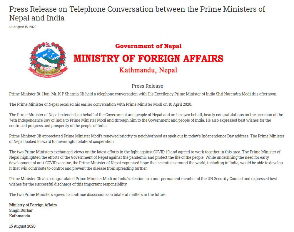 प्रधानमन्त्री ओली र मोदीबीच टेलिफोन वार्ता, मोदीलाई के भने ओलीले ? (परराष्ट्रको विज्ञप्तिसहित)