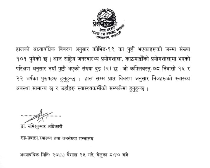 काठमाडौं । नेपालमा बिहीबार २ जना कोरोना संंक्रमित थपिएका छन् । कपिलबस्तुमा २ जनामा कोरोना पोजेटिभ देखिएको स्वास्थ्य मन्त्रालयले जनाएको छ । नेपालमा कोरोना संक्रमितको संख्या १०१ पुगेको छ । कोरोना संक्रमण जोखिमका कारण चैत ११ देखि नेपालमा लकडाउन छ ।