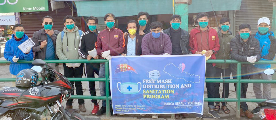 पोखरा । विश्वभर महामारी रूपमा फैलिदै गरेको ‘नोबेल कोराना भाइरस’का कारण पछिल्लो समय नेपालमा समेत जोखिम बढेपछि बजारमा मास्कको अभाव भएको छ । मास्कको माग अत्याधिक भएपछि पोखरेली फूटबल प्रेमिहरूको संस्था बार्सा नेपाल पोखराले शनिबार पोखराका मुख्य चोकहरूमा मास्क निःशुल्क वितरण गरेकोछ । साथै संस्थाले कोरोना सचेतना सम्बनधी पम्प्लेट बितरण कार्यक्रम समेत गरेको छ ।