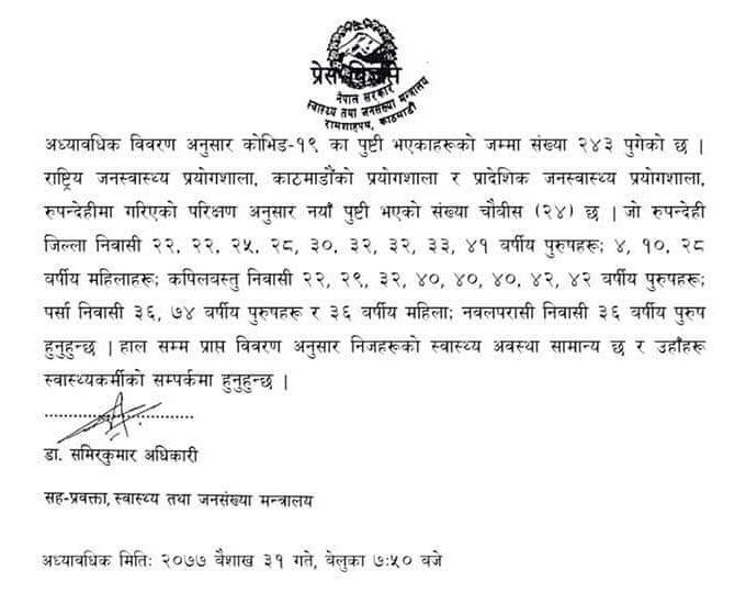 काठमाडौं । नेपालमा कोरोना संक्रमित थपिने क्रम बढेको छ । बुधबार मात्रै नेपालमा थप २४ जनामा कोरोना देखिएको छ ।