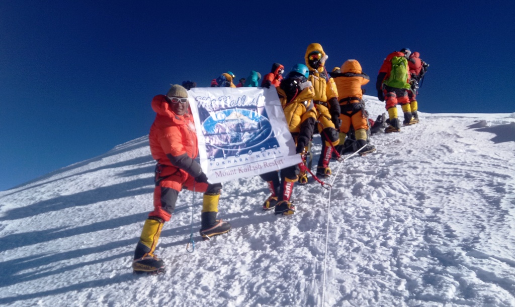 पोखराको माउण्ट कैलाश रिसोर्टको लोगो विश्वको सर्वोच्च शिखर सगरमाथाको शिखरमा पुगेको छ । आरोही गेल्जे शेर्पाले माउण्ट कैलाश होटलको लोगो सर्वोच्च शिखर सगरमाथामा पु¥याएका हुन् । ओखलढुङगा खिजिदेम्बा गाउँपालिका २ नस्पुका शेर्पाले ९ पटक सगरमाथाको सफल आरोहण गरी सकेका छन् । अन्तराष्ट्रिय पथप्रर्दशक समेत रहेका उनले जेठ २ गते विहान ७ बजे माउण्ट कैलाश रिसोर्टको लोगो शिखरमा फराएका थिए ।