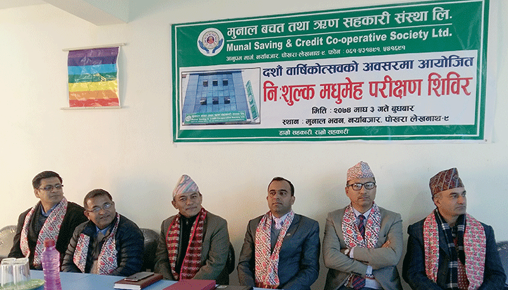 पोखरा, ३ माघ । कास्की जिल्लाभरि कार्यक्षेत्र रहेको पोखराको मुनाल बचत तथा ऋण सहकारी संस्था लि. बुधबारबाट स्थापनाको नवौं वर्ष पूरा गरी दशौं वर्षमा प्रवेश गरेको छ । दशौं वार्षिकोत्सवको अवसरमा सहकारीले आफ्ना शेयर सदस्यहरूलाई लक्षीत गरि कार्यालय परिसरमा निःशुल्क मधुमेह परीक्षण शिविरको आयोजना गरेको छ । आरोग्यधाम होमियोप्याथिक हस्पिटलको प्राबिधिक सहयोगमा आयोजित उक्त शिबिरमा १०४ जनाले मधुमेह परीक्षण गराएको संस्थाका अध्यक्ष दुर्गाप्रसाद हुमागाईंले बताए ।