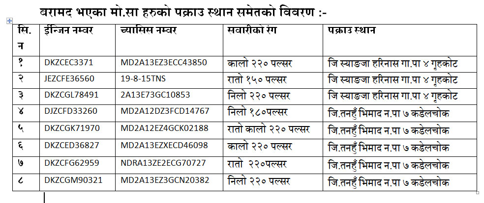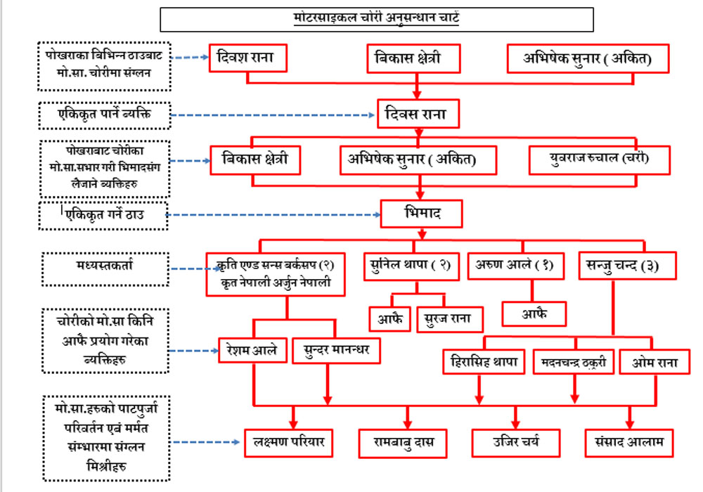 कास्कीका विभिन्न मिति र समयमा विभिन्न स्थानहरुबाट स्कुटर, मोटरसाकलहरु चोरी गरी चोरेका सवारी साधनहरुको नम्वर प्लेट एवं स्वरुप परिवर्तन गरि बेचबिखन गर्ने गिरोहहरु सक्रिय रहेको भन्ने सूचना प्रहरीलाई आयो । सोही सूचनाका आधारमा मिति २०७४।१२।१० गते बिहान अन्दाजी ९ः३० बजेको समयमा कास्की पोखरा लेखनाथ महानगरपालिका वडा नं ३ नदिपुरस्थित फिल्महलको पार्किङमा मोटरसाइकल चोर्दै गरेको अबस्थामा प्रहरी कार्यालय कास्कीबाट खटिएको प्रहरी टोलीले २ जनालाई पक्राउ ग¥यो ।