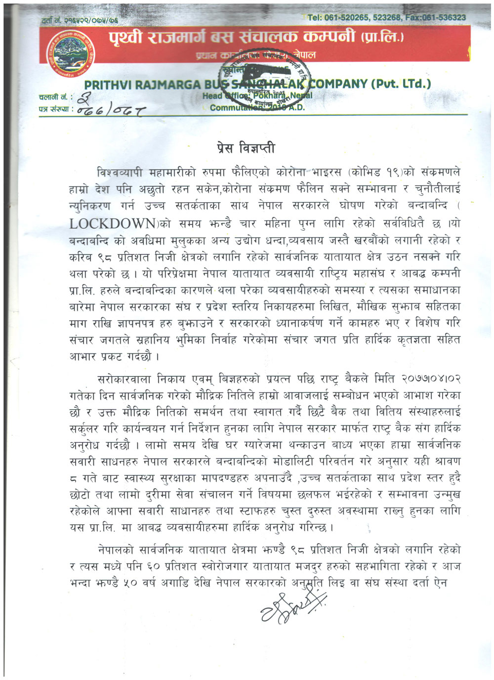 लामो तथा छोटो दुरीमा सवारी सञ्चालन गर्नका लागि छलफल तथा तयारी भइरहेकाले सवारी साधनहरु तथा कर्मचारीहरुलाई चुस्तदुरुस्त अवस्थामा राख्न प्रालिले व्यवसायीहरुलाई आग्रह समेत गरेको छ ।