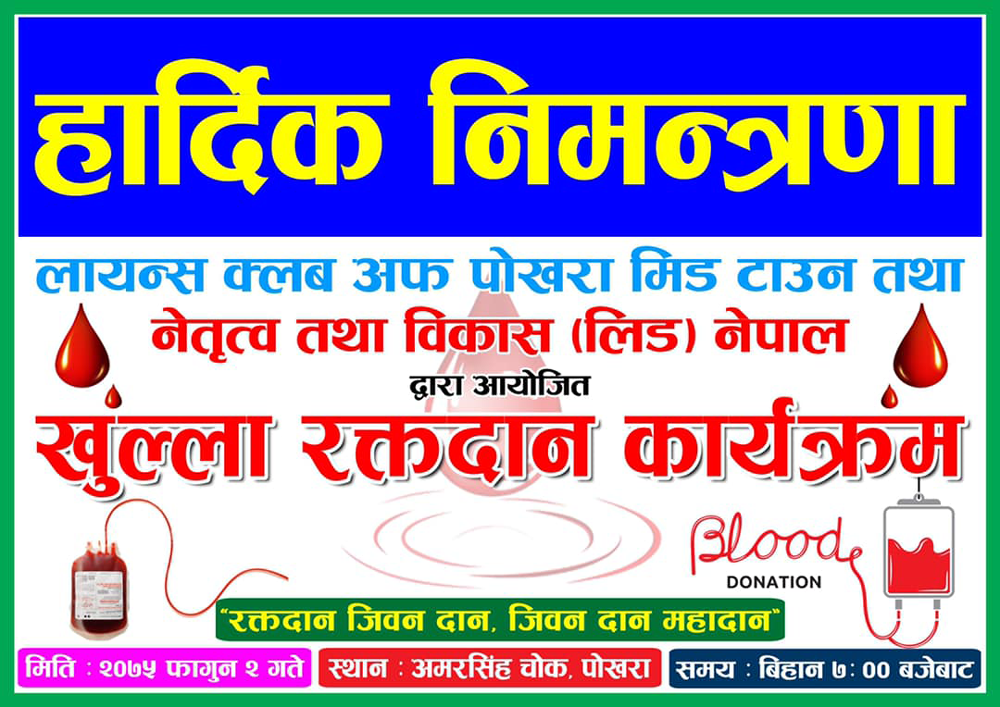 पोखरा, २८ माघ । रक्तदान जीवनदान, जीवनदान महादान उद्देश्यका साथ लायन्स क्लब अफ पोखरा मिड टाउन तथा नेतृत्व विकास लिड नेपालको पहलमा रक्तदान कार्यक्रम गरिने भएको छ । आगामी फागुन २ गतेका दिन बिहान सात बजेबाट अमरसिहचोकस्थित रक्तदान कार्यक्रम आयोजना गरिने भएको हो ।