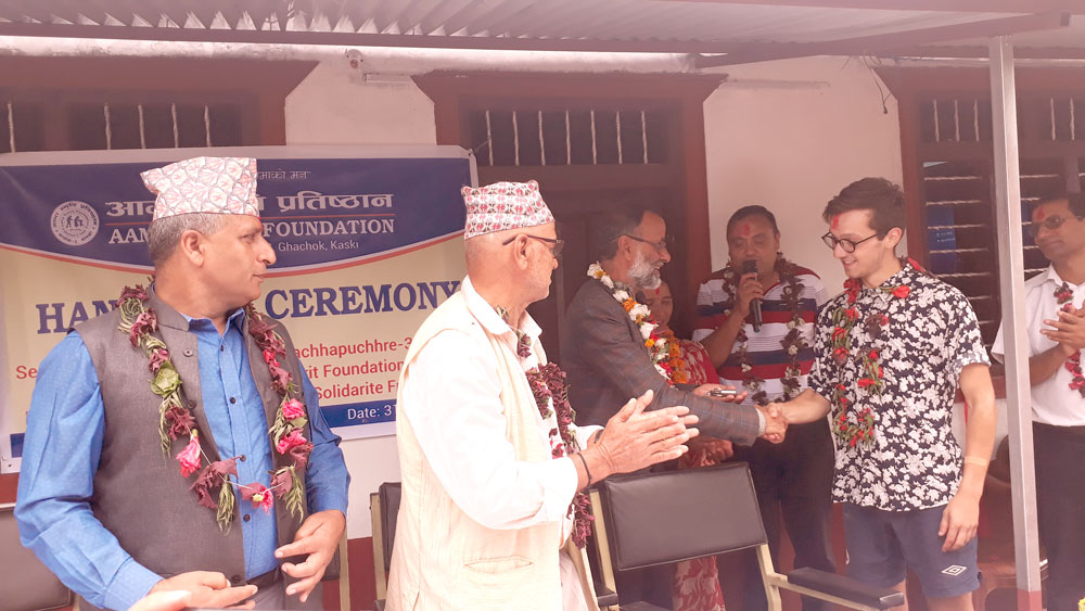 फ्रान्सको ईसिएसटी विश्वविद्यालयमा अध्ययनरत ६ जना विद्यार्थीले आफ्नो खाजा खर्च कटाएर बचत गरेर राखेको रकमले माछापुच्छ्रे गाउँपालिका वडा नम्बर ३ ढोकाकोमुख पाटन, घाचोकमा ज्येष्ठ नागरिक दीवा सेवा केन्द्र निर्माण गरिदिएका छन् । ‘सोलिडारिटी फ्रान्स–नेपाल’का सदस्यहरु ग्यास्पर्ड, माटिल्ड, इनेस, हेनरी, सर्जो र वृयूले सो केन्द्र निर्माण गरेका हुन् । उनीहरुले खाजा खर्च कटाएको रकम मात्र खर्च गरेनन् बरु स्वयम्सेवी जनश्रमदानसमेत गरेर केन्द्र स्थापना गरेका हुन् । उनीहरुको प्रयासमा समाजसेवी तथा पर्यटन व्यवसायी वसन्तराज दवाडीले आफ्नी आमाको स्मृतिमा स्थापना गरेको ‘आमा स्मृति प्रतिष्ठान’ले होस्टेमा हैंसे गरेको छ भने माछापुच्छ्रे गाउँपालिका कार्यालय, सम्बन्धित वडा नम्बर ३ कार्यालय र अन्नपूर्ण संरक्षण क्षेत्र आयोजना (एक्याप)ले सहयोग गरेको छ ।