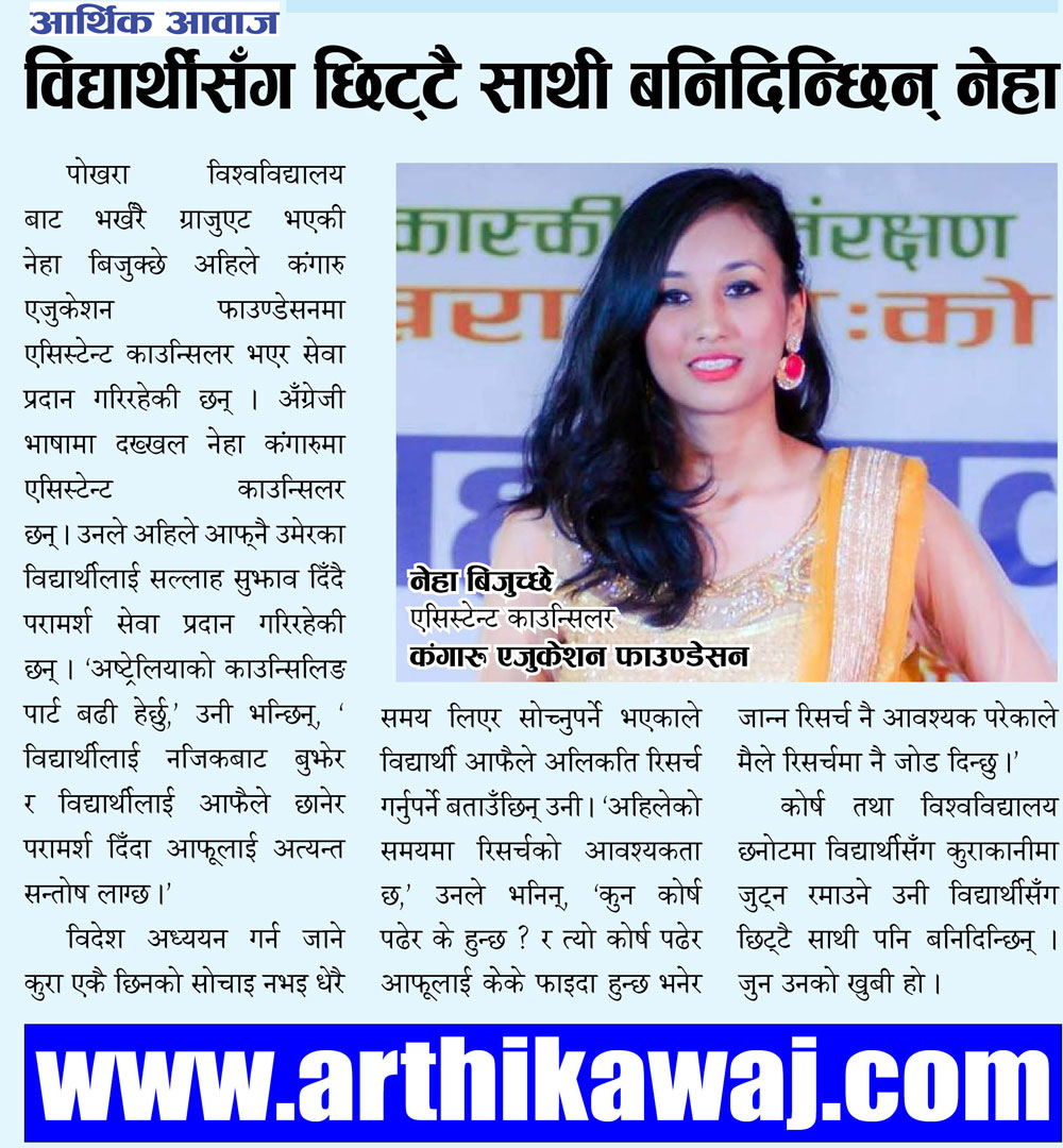 पोखरा विश्वविद्यालय बाट भर्खरैै ग्राजुएट भएकी नेहा बिजुक्छे अहिले कंगारु एजुकेशन फाउण्डेसनमा एसिस्टेन्ट काउन्सिलर भएर सेवा प्रदान गरिरहेकी छन् । अँग्रेजी भाषामा दख्खल नेहा कंगारुमा एसिस्टेन्ट काउन्सिलर छन् । उनले अहिले आफ्नै उमेरका विद्यार्थीलाई सल्लाह सुुझाव दिँदै परामर्श सेवा प्रदान गरिरहेकी छन् । ‘अष्ट्रेलियाको काउन्सिलिङ पार्ट बढी हेर्छु,’ उनी भन्छिन्, ‘विद्यार्थीलाई नजिकबाट बुझेर र विद्यार्थीलाई आफैले छानेर परामर्श दिँदा आफूलाई अत्यन्त सन्तोष लाग्छ ।’