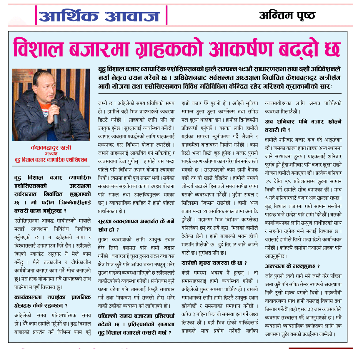 वुद्ध विशाल बजार व्यापारिक एशोसिएसनको हालै सम्पन्न १९औं साधारणसभा तथा दशौं अधिवेशनले नयाँ नेतृत्व चयन गरेको छ । अधिवेशनबाट सर्वसम्मत अध्यक्षमा निर्वाचित केशवबहादुर खत्रीसँग भावी योजना तथा एसोसिएसनका विविध गतिविधिमा केन्द्रित रहेर गरिएको कुराकानीको सारः