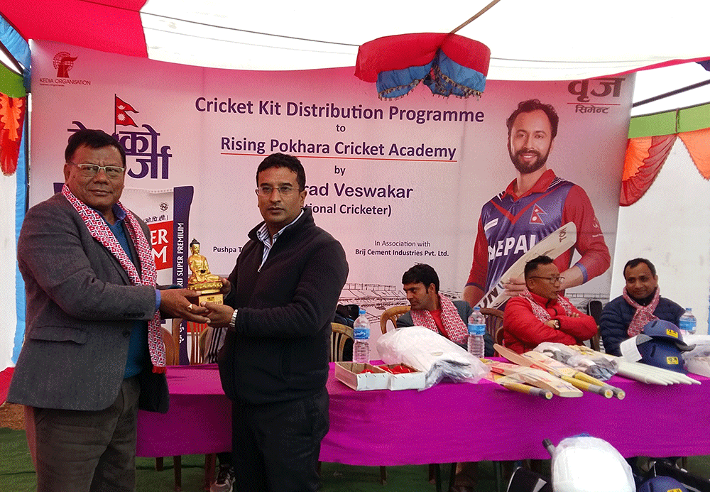 पोखरा, ११ माघ । राइजिङ पोखरा क्रिकेट एकेडेमीलाई पुष्पतारा केडिया सेवा संस्थाद्वारा आयोजित एवं वृज सिमेन्ट इण्डष्ट्रीजद्वारा प्रायोजन गरिएको क्रिकेट सामग्री बुधबार एक समारोहका बीच हस्तान्तरण गरिएको छ । राष्ट्रिय क्रिकेट टिमका खेलाडी तथा वृज सिमेन्टका ब्राण्ड एम्बेस्डर शरद भेषवाकरले सामग्री हस्तान्तरण गरेका हुन् ।