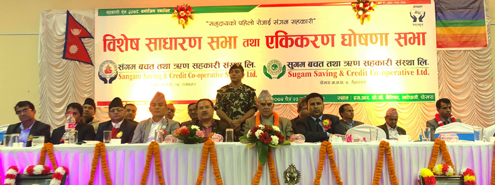 पोखरा, २३ चैत । कास्कीमा बिगत लामो समयदेखि संचालनमा रहेका २ सहकारी संस्था एकीकरण भएका छन् । २०६१ साल वैशाखबाट कारोबार सुरु गरी २०६४ चैत्रबाट विधिवत् दर्ता गरी पोखार–१५, रामबजारबाट आफ्नो सेवा प्रदान गरिरहेको संगम बचत तथा ऋण सहकारी संस्था लि. र २०६५ असोजबाट विधिवत दर्ता गरी पोखरा–४, गैह्रापाटनबाट आफ्नो सेवा प्रदान गरिरहेको सुगम बचत तथा ऋण सहकारी संस्था लि. एक आपसमा एकीकरण भएका हुन् । दुवै सहकारीको एकीकरण घोषणा सभा शनिबार पोखरामा सम्पन्न भएको सहकारीका वरिष्ठ व्यवस्थापक अपिल कोइरालाले जानकारी दिए । गण्डकी प्रदेशका प्रमुख बाबुराम कुँवरको प्रमुख आतिथ्यतामा कार्यक्रम भएको हो ।