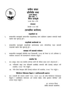 त्यसपछि अर्थमन्त्री जनार्दन शर्माले आव २०७९/०८० को लागि विनियोजन विधेयकका सिद्धान्त र प्राथमिकता सम्बन्धमा (कर प्रस्तावबाहेक) माथि छलफल गरियोस् भनी प्रस्ताव प्रस्तुत गर्ने सम्भावित कार्यसूची रहेको छ । बैठक अपराह्न ४ बजेका लागि डाकिएको छ।