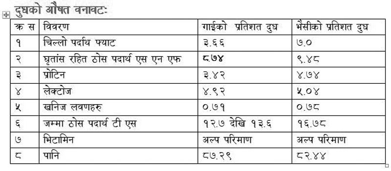 गाइको दूध भन्नाले ३.५ प्रतिशत दूधको चिल्लो र सो चिल्लो बाहेक दूधको ठोस पदार्थ ७.५ प्रतिशत भन्दा घटि नभएको दूध र भैसीको दूध भन्नाले ५ प्रतिशत दूधको चिल्लो र सो चिल्लो बाहेक दूधको ठोस पदार्थ ८ प्रतिशत भन्दा घटि नभएको हुनुपर्दछ ।