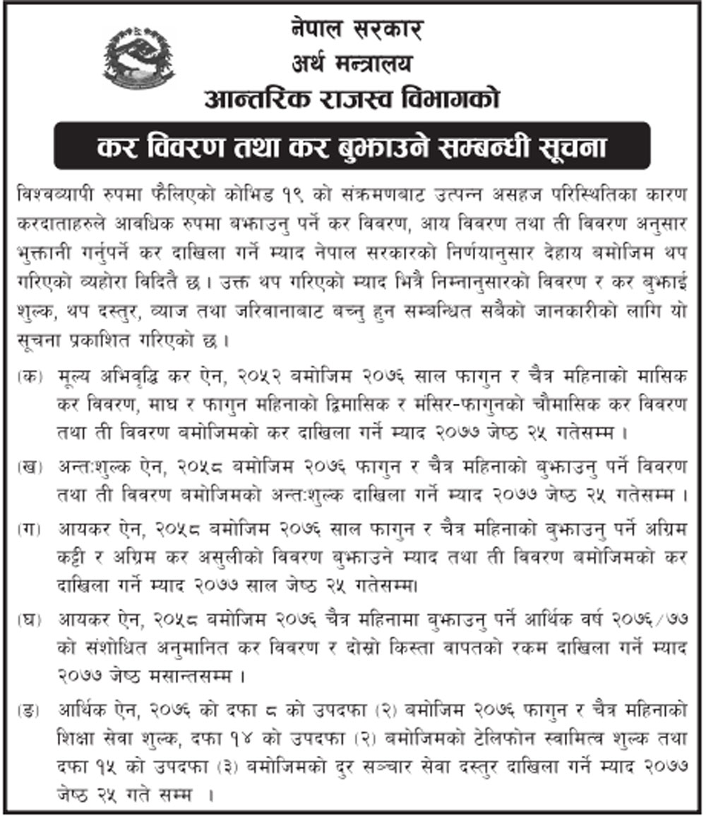 पोखरा । आन्तरिक राजश्व विभागले जेठ २५ गतेसम्म राजश्व बुझाउनुपर्ने सूचना प्रकाशित गरेको छ । जुन सूचना यतिबेला सामाजिक सञ्जालमा भाइरल छ । कोरोना महामारीबाट विश्व नै प्रभावित भइरहेको अवस्थामा नेपाल पनि चैत ११ गतेदेखि लकडाउन छ । लकडाउनका कारण सम्पूर्ण व्यापार व्यवसाय नै ठप्प छन् । करदाता उद्योगी व्यवसायी व्यवसाय बन्द गरेर घरमा थुनिएर बसेका छन् ।