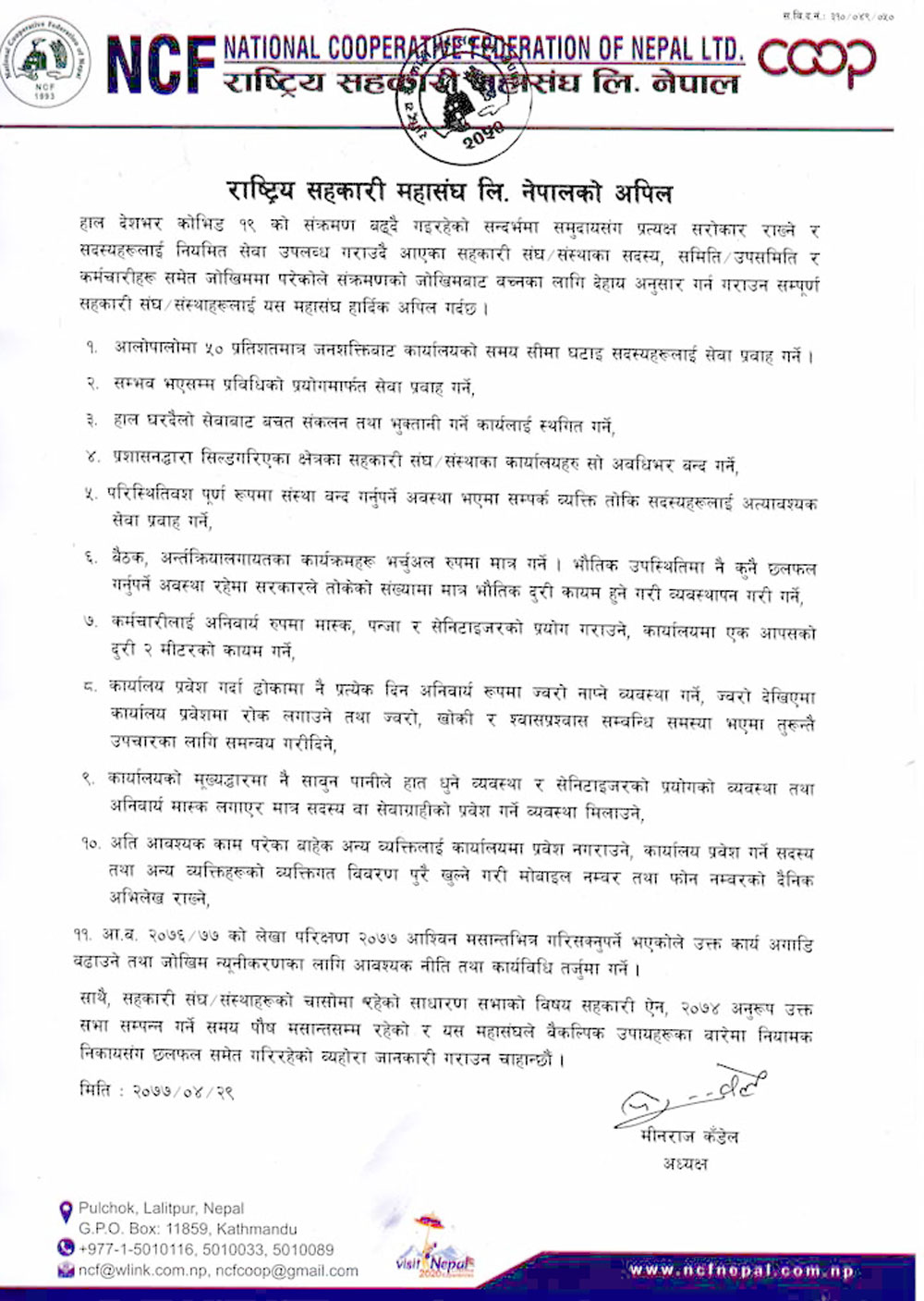 महासंघका अध्यक्ष मीनराज कँडेलद्वारा हस्ताक्षरित अपिलमा भनिएको छ, ‘सम्भव भएसम्म प्रविधिको प्रयोगमार्फत सेवा प्रदान गर्ने, घरदैलो सेवाबाट बचत संकलन तथा भुक्तानी सेवालाई स्थगित गर्ने ।’