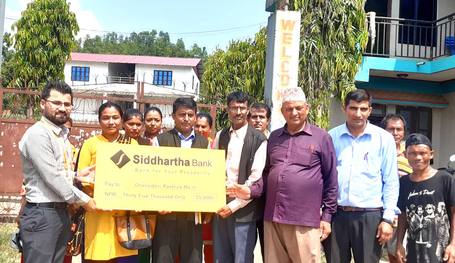 तनहुँ, १२ असार । सिद्धार्थ बैंक दमौली शाखाले संस्थागत सामाजिक उत्तरदायित्व निर्वाह गर्दै विद्यालयलाई सहयोग गरेको छ । विद्यालयलाई सफा, सुन्दर र हरियाली बनाउने उद्देश्यले विद्यालयले थालेको ‘सफा र स्वच्छ’ अभियानलाई सघाउन बैंकले व्यास–१० बैरेनीस्थित चण्डीदेवि राष्ट्रिय माविलाई नगद रु. ३५ हजार आर्थिक सहयोग गरेको बैंकका शाखा प्रबन्धक सुरेश न्यौपानेले जानकारी दिए ।
