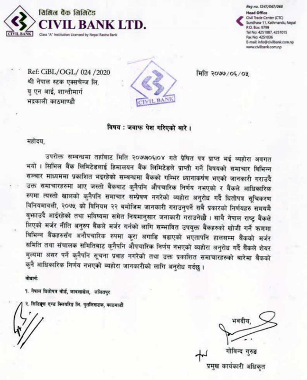 ‘सिभिल बैंक लिमिटेडलाई हिमालयन बैंक लिमिटेडले प्राप्ती गर्ने विषयको समाचार विभिन्न सञ्चार माध्यममा प्रकाशित भइरहेको सम्बन्धमा बैंकको गम्भीर ध्यानाकर्षण भएको जानकारी गराउँदै उक्त समाचारहरुमा आए जस्तो बैंकबाट कुनैपनि औपचारिक निर्णय नभएको,’ विज्ञप्तिमा उल्लेख छ, ‘बैंकले आधिकारिक रुपमा त्यस्तो खालको कुनैपनि समाचार सम्प्रेषण नगरेको अनुरोध गर्दै धितोपत्र सूचीकरण विनियमावली, २०७५ को विनियम २२ बमोजिम जानकारी गराउनुपर्ने सबै प्रकारको निर्णयहरु समयमै बुझाउँदै आइरहेको तथा भविष्यमा समेत नियमानुसार जानकारी गराउनेछौं ।’