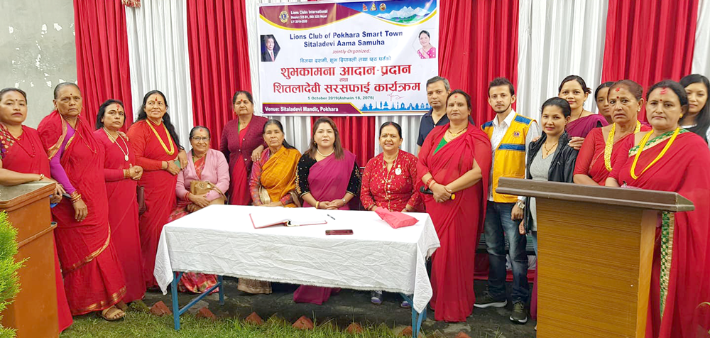 पोखरा । लायन्स क्लब अफ पोखरा स्मार्ट टाउनले शुभकामना आदानप्रदान तथा सरसफाई कार्यक्रम सम्पन्न गरेको छ । क्लबका द्वितीय उपाध्यक्ष तथा कार्यक्रम संयोजक निलम कर्माचार्यको अध्यक्षतामा पोखराको शीतलादेवीमा आयोजित कार्यक्रममा २ वटा डस्टविन पनि वितरण गरिएको छ । वातावरणका क्षेत्रमा काम गर्दै आइरहेको संस्था बाबा फाउण्डेसनले डस्टविन सहयोग गरेको कर्माचार्यले जानकारी दिइन् ।