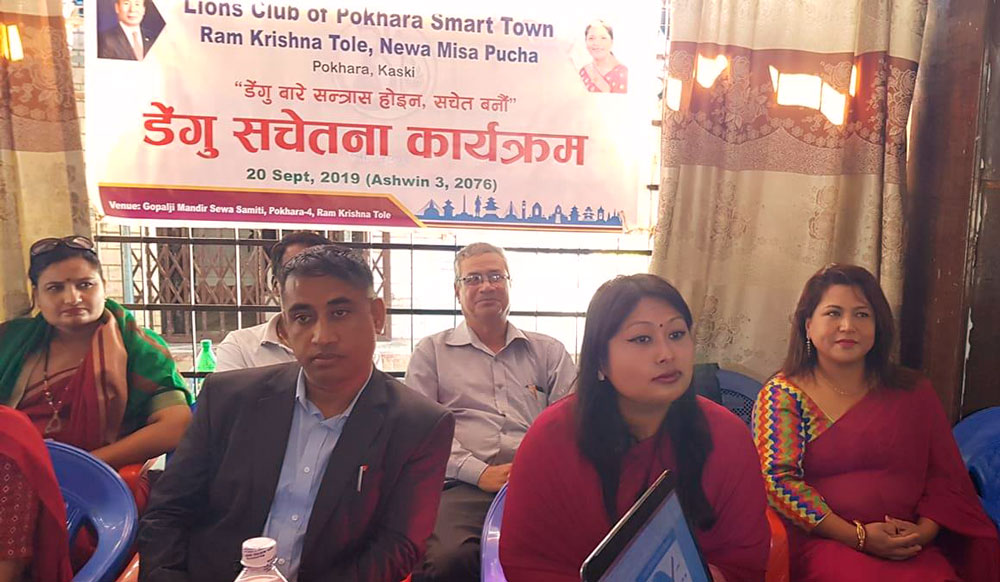 पोखरा, ५ असोज । लायन्स क्लब अफ पोखरा स्मार्ट टाउनको आयोजनामा डेंगु रोगसम्बन्धी सचेतना कार्यक्रम सम्पन्न भएको छ । रामकृष्ण टोल नेवा मिसा पुचसँगको सहकार्यमा कार्यक्रम गरिएको क्लबका अध्यक्ष कविता श्रेष्ठले जानकारी दिइन् । पछिल्लो समय डेंगु रोग बढेकाले सचेतना जगाउने लक्ष्यसहित कार्यक्रम आयोजना गरिएको क्लबका द्वितीय उपाध्यक्ष एवं कार्यक्रम संयोजक निलम कर्मचार्यले जानकारी दिइन् ।