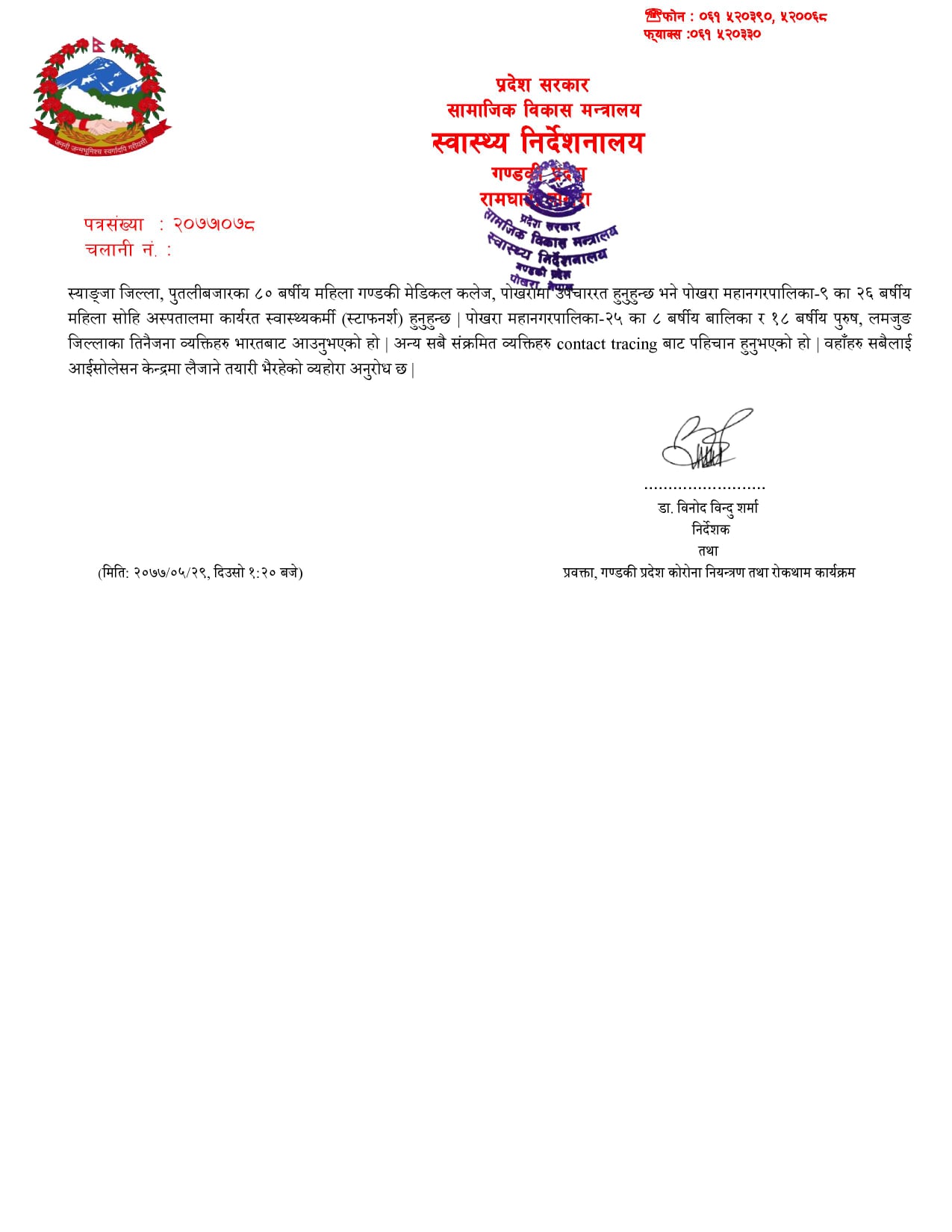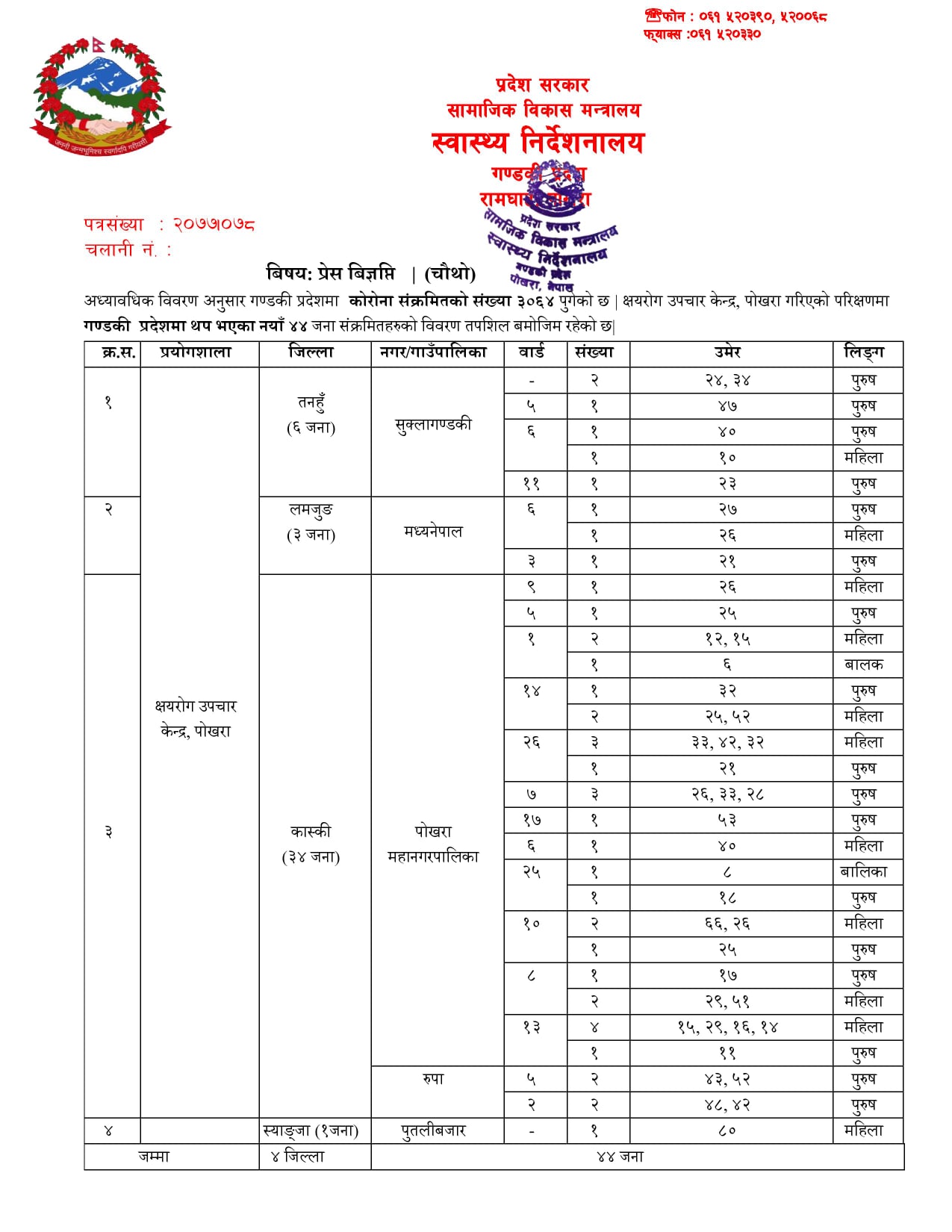संक्रमित हुनेमा तनहुंका ६ जना, कास्कीका ३४ जना, लमजुङका ३ जना र स्याङ्जाका १ जना रहेको स्वास्थ्य निर्देशनालय गण्डकी प्रदेशले जनाएको छ ।